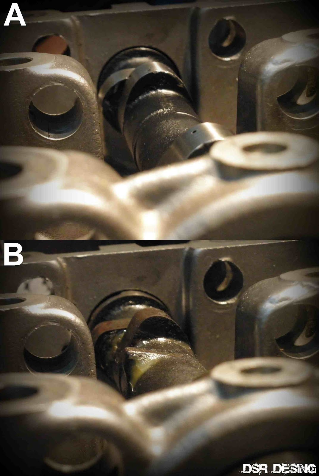 Las paredes de la Cámara pulida, para que ayude a la evacuación de los gases. Justo a la izquierda de la Válvula de Admisión, se aprecia el tabique que ayuda a utilizar también esa parte de la Válvula de Escape, y así tener una rápida salida de los gases. Además de la nueva configuración del Árbol de Levas